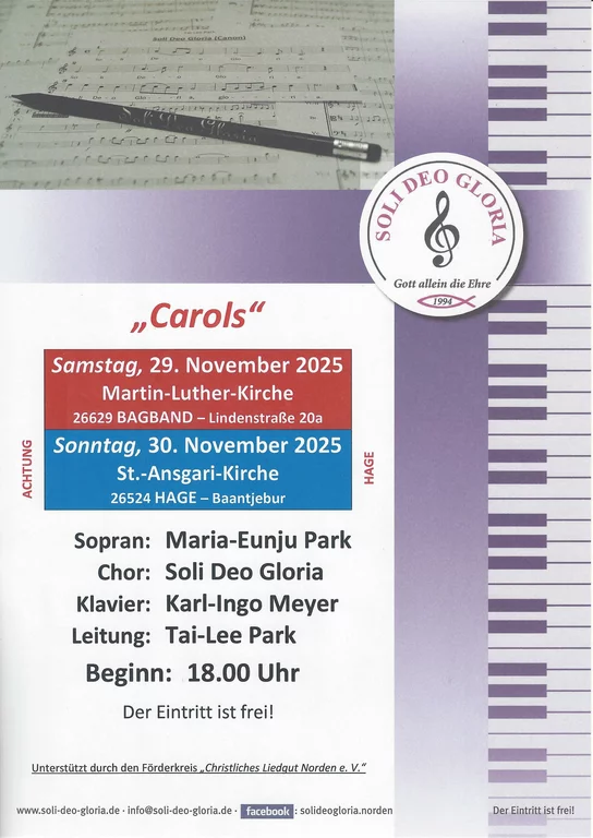 Adventliche Klänge in Hage Chor „Soli Deo Gloria“ eröffnet die Adventszeit mit festlichem Programm Hage – Der Norder Chor Soli Deo Gloria eröffnet die Adventszeit in diesem Jahr mit einem besonderen musikalischen Programm – und an neuen Aufführungsorten. Statt wie gewohnt in der Norder Ludgeri-Kirche singt der Chor am Samstag, 29. November, in der Martin-Luther-Kirche Bagband und am Sonntag, 30. November, in der St.-Ansgari-Kirche Hage. Beginn ist jeweils um 18 Uhr. Der Grund für den Ortswechsel ist ganz einfach: „Die St.- Ansgari-Kirche lässt sich im Winter besser beheizen – das kommt sowohl dem Publikum als auch den Sängerinnen und Sängern zugute“, erklärt Chorleiter Tai-Lee Park. Moderne Carols und festliche Fanfaren Musikalisch bietet Soli Deo Gloria ein abwechslungsreiches Programm. Unter der Leitung von Tai-Lee Park widmet sich der Chor im ersten Teil modernen Kompositionen und festlichen Carols – jenen lebendigen englischen Weihnachtsliedern, die seit dem Mittelalter mit rhythmischer Fröhlichkeit und eingängigen Refrains die Botschaft von Freude und Hoffnung verkünden. Drei dieser Carols stammen von John Rutter, der ein postmoderner Komponist ist, besonders durch viele Chorliteraturen berühmt wurde und in diesem Jahr seinen 80. Geburtstag feiert. Ergänzt wird das Programm durch Werke von Klaus Heizmann und Dieter Golombek. Der erste Teil wird mit der „Weihnachtsfanfare“von Joseph M. Martin, einem Feuerwerk von Tönen, abgeschlossen. Klassische Glanzlichter mit Sopranistin Dann übernimmt Sopranistin Maria-Eunju Park das Programm weiter. Unter anderem singt die Opernsängerin Laudate Dominum aus der “Vesperae solennes de Confessore” und Alleluia aus der "Exultate, jubilate" von Wolfgang A. Mozart. Im dritten Teil folgen klassische Glanzlichter von Mozart und Händel – darunter „Ave verum corpus“, „Denn es ist uns ein Kind geboren“ und das unsterbliche „Halleluja“ aus dem Messias. Begleitet wird der Chor am Klavier von Karl-Ingo Meyer, die musikalische Leitung liegt bei Tai-Lee Park. Unterstützt wird das Konzert vom Förderkreis „Christliches Liedgut Norden e. V.“. Der Eintritt ist frei – Ein Abend , der trotz Ortswechsels an seiner Tradition festhält: Musik voller Licht, Freude und Glauben